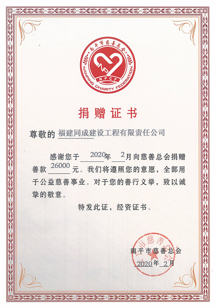 公司向南平市慈善总会 “抗击疫情”捐款26000元