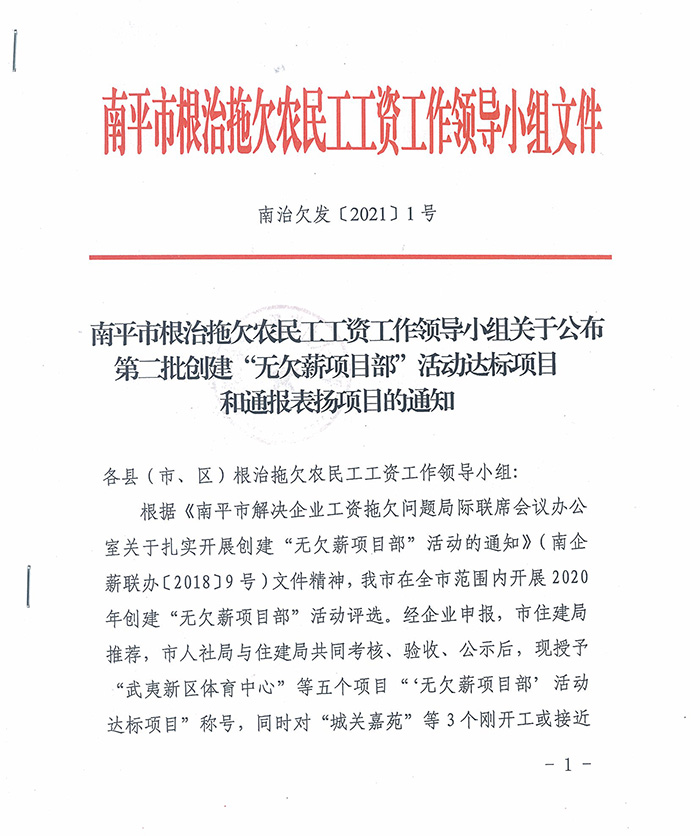南平市无欠薪项目部通报表扬文件